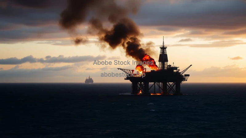 A burning oil rig in the ocean black smoke rising into the sky dramatic disaster shot