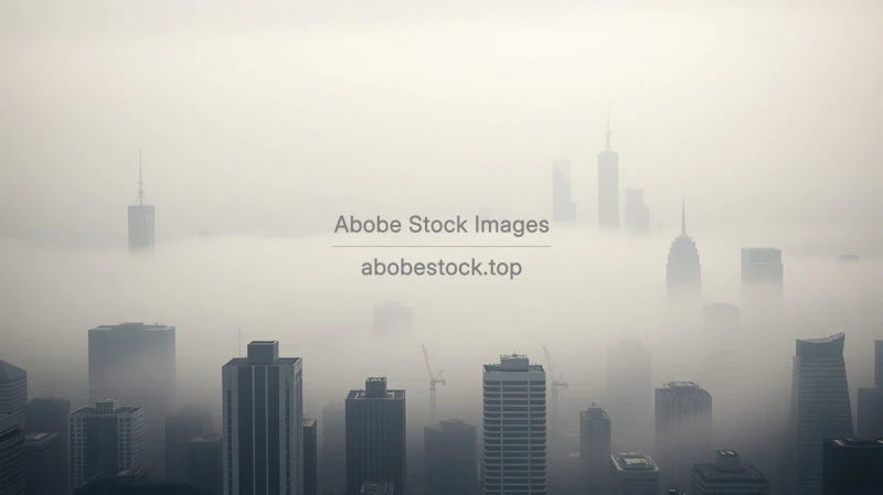 A city skyline covered in heavy smog with barely visible skyscrapers moody desaturated