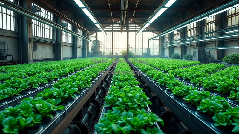 A futuristic hydroponic farm inside an old repurposed factory vibrant greens