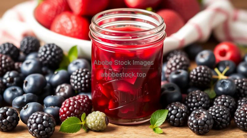 A jar of homemade jam with berries around it