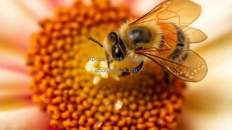 A macro shot of pollen on a bee visiting a flower