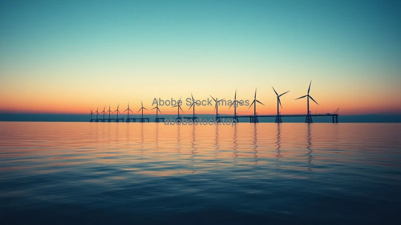 A massive offshore wind farm at dusk reflections in calm sea cinematic