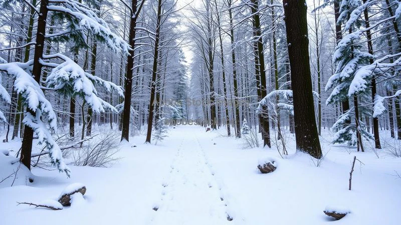 A peaceful snowy forest with wildlife tracks