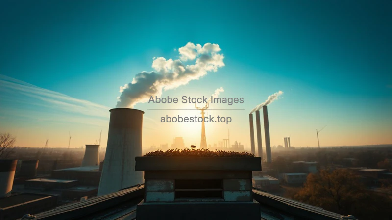 A rooftop beehive framed by smokestacks in the distance tension between hope and crisis