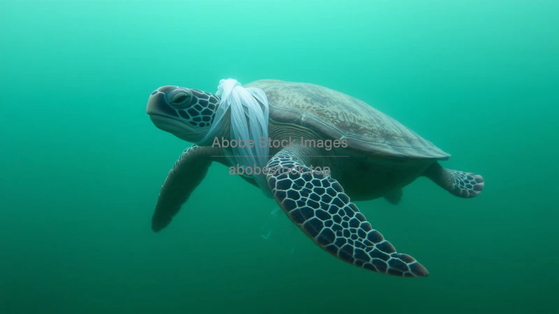 A sea turtle tangled in plastic bags underwater with hazy greenish light