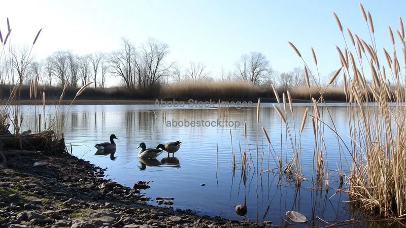 A serene riverbank with ducks and reeds