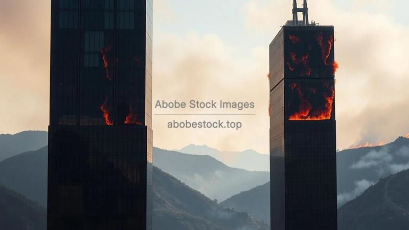 A skyscraper mirrored glass facade reflecting raging wildfires in nearby hills