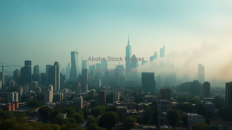 A timelapse style composite city skyline transitioning from green to polluted dystopian