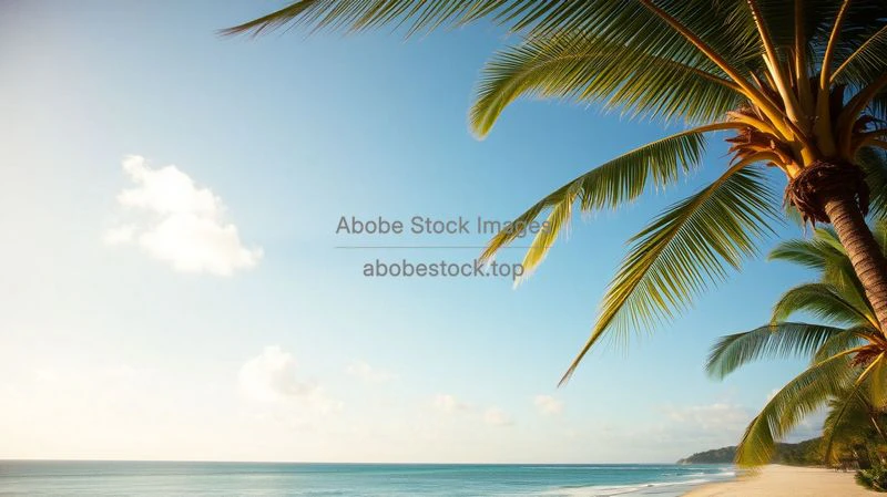 A tropical palm tree swaying by the ocean