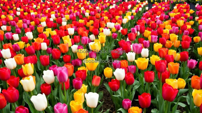 A vibrant tulip garden arranged in patterns