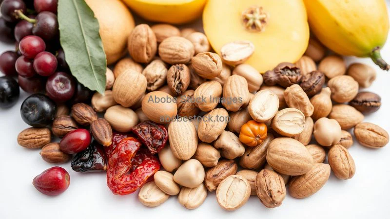 An arrangement of assorted nuts and dried fruits