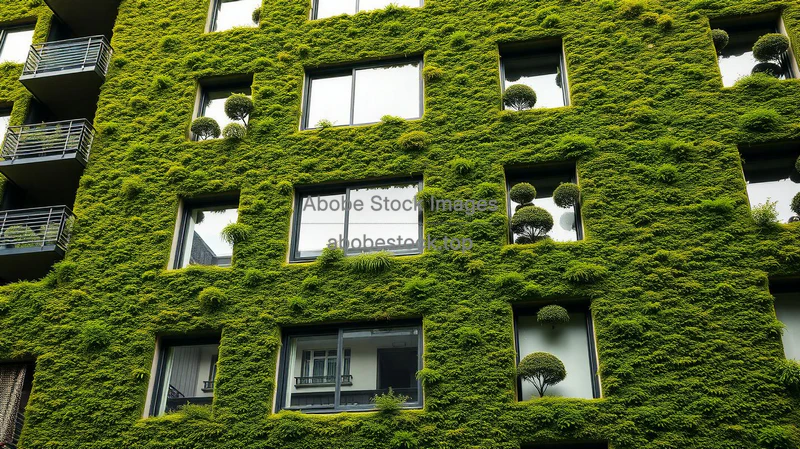 An urban building facade entirely covered with moss and algae panels biodesign