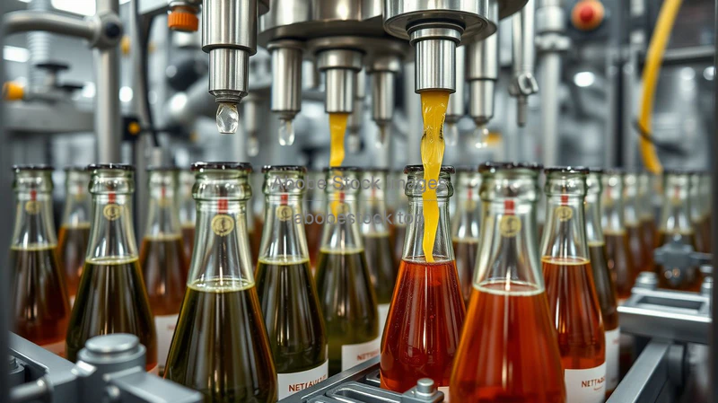 Automated bottling plant filling glass bottles with beverages mechanical precision detailed close up
