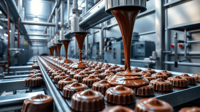 Automated chocolate factory with liquid chocolate flowing through pipes molds on conveyor belts appetizing scene