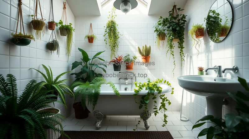 Bathroom with hanging plants and ferns around a clawfoot tub, white tiles, natural light from skylight, detailed image