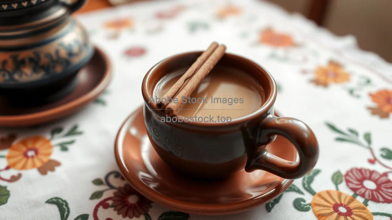 Café de olla in clay mug with cinnamon stick, traditional Mexican tablecloth