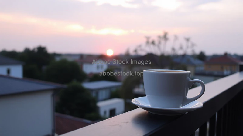 Cappuccino at sunrise on balcony railing, soft pastel sky, peaceful mood