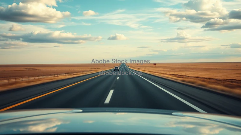 Car traveling through endless straight highway in American Midwest vast sky