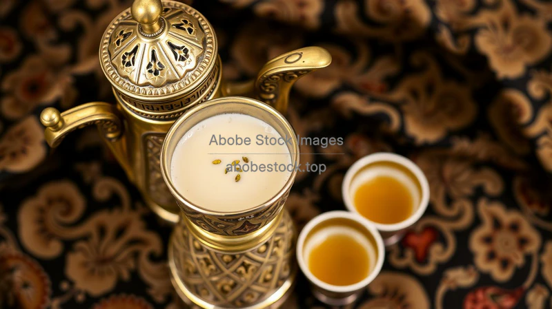 Cardamom coffee in ornate Arabic coffee pot with small cups, patterned fabric background