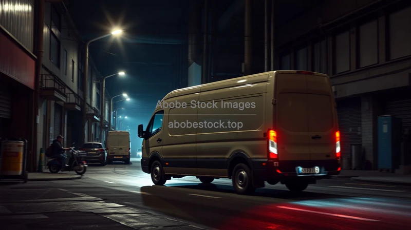 Cargo van making night deliveries in a dimly lit industrial area gritty look