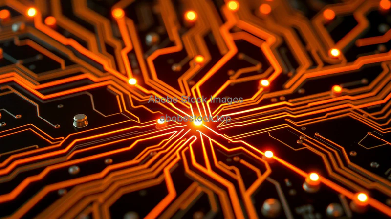 Circuit board illustrating physics of electrons moving through conductors neon pathways macro