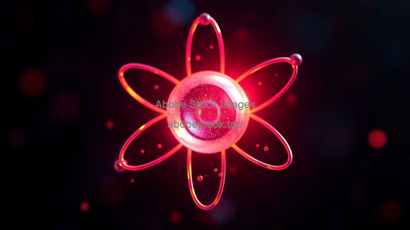 Close up of a single atom with orbiting electrons quantum visualization vibrant colors dark background