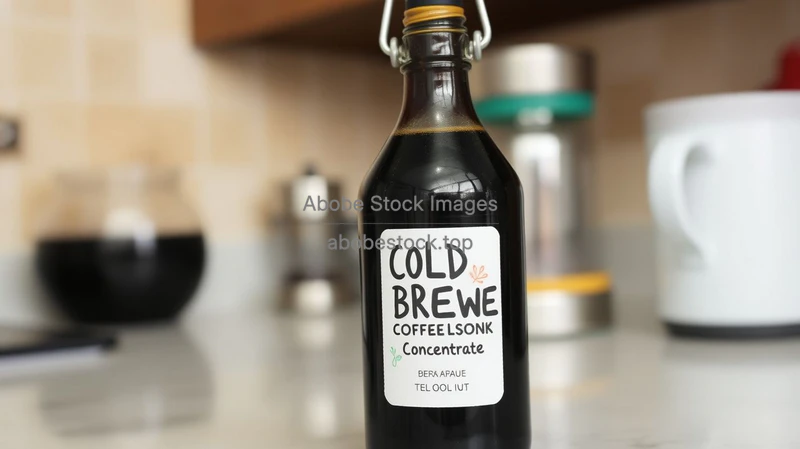 Cold brew coffee concentrate in dark glass bottle with label, kitchen counter