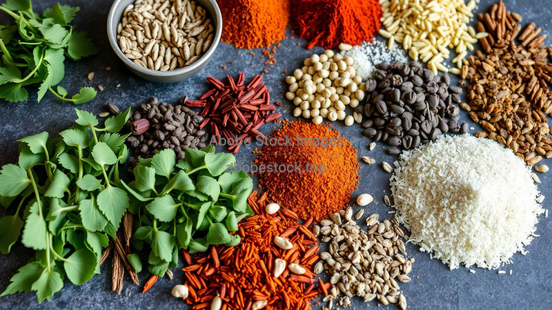 Colorful assortment of spices herbs and seeds arranged neatly on a table