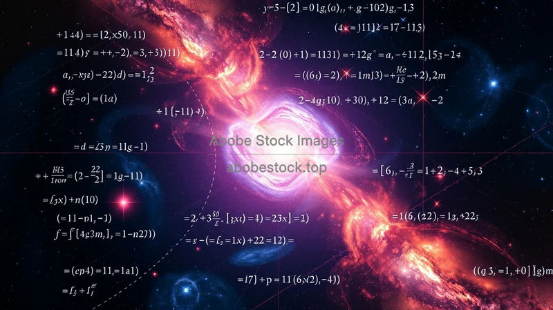 Conceptual art of a universe made of equations glowing mathematical symbols forming galaxies