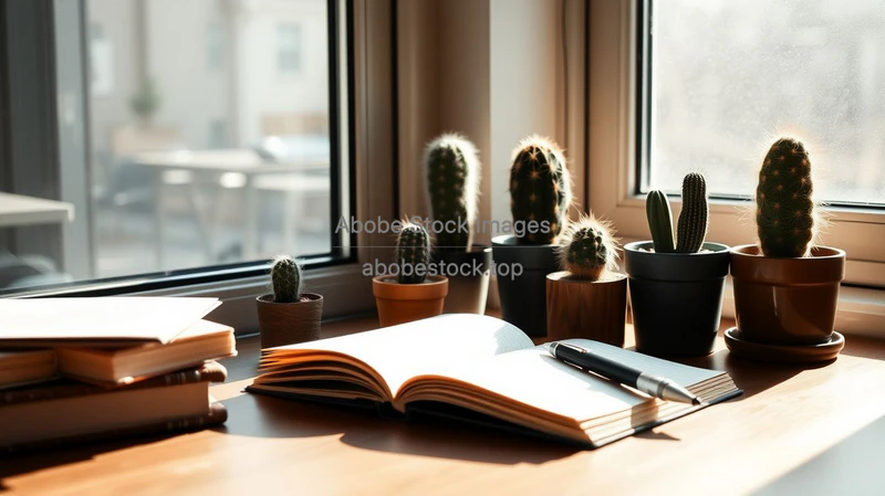 Desk by the window with cactus collection, open notebook and pen, morning light, productivity vibe