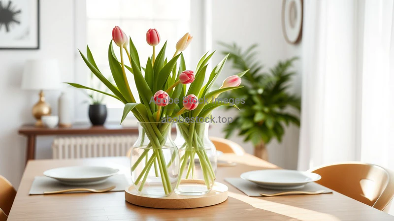 Dining table centerpiece with vase of fresh tulips, minimalist decor, bright morning light, lifestyle photo