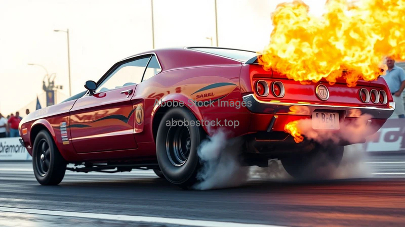 Drag racing car launching from starting line flames from exhaust intense action