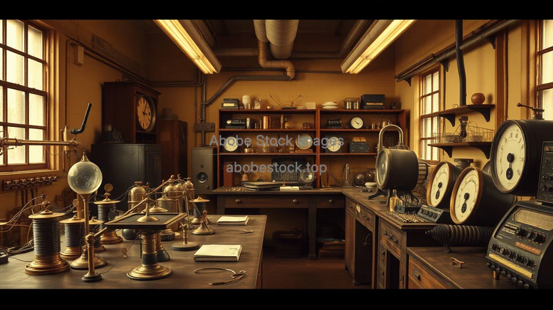Early 20th century physics lab with brass instruments coils and galvanometers warm sepia tones