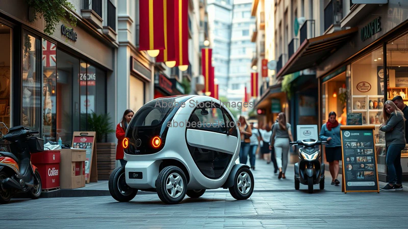 Electric microcar in a dense pedestrian shopping street modern lifestyle