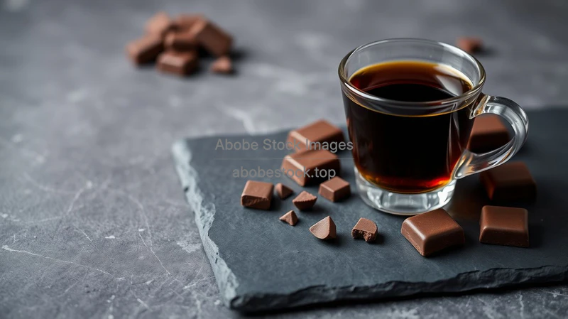 Espresso with dark chocolate pieces on slate board, refined elegant styling