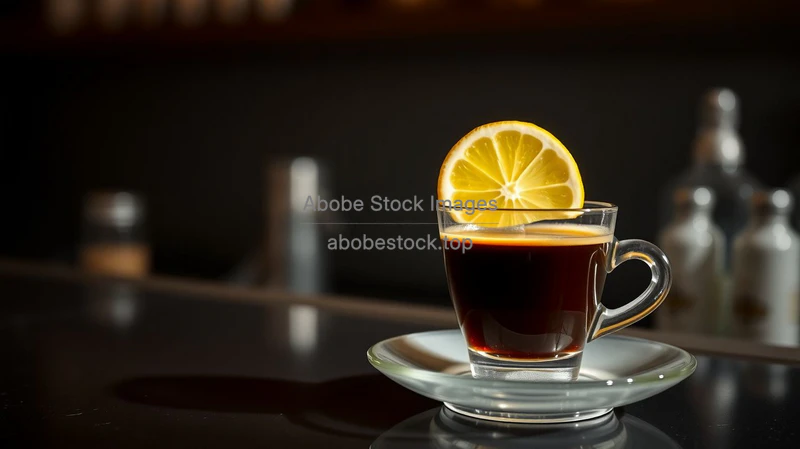 Tags: artful coffee, atmospheric, bar scene, barista, beverage art, beverage presentation, black coffee, breakfast, caffeinated beverage, cinematic lighting, citrus garnish, close-up, coffee cup, cozy cafe, dark bar counter, elegant, espresso, food photography, gourmet coffee, high quality, lemon twist, luxury, moody, morning routine, prepared coffee, professional photography, restaurant, saucer, stylish, warm lighting
