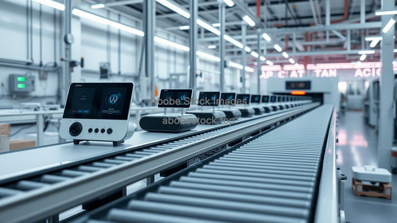 Factory for smart home devices with compact gadgets moving along slender conveyor belts sleek modern design