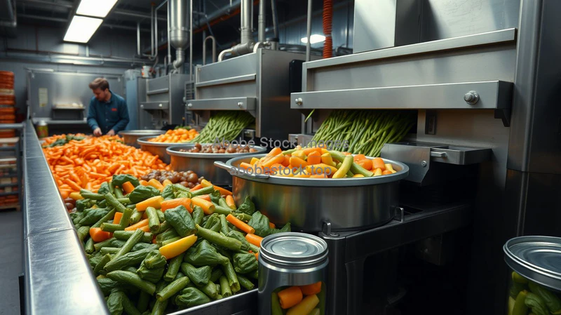 Food canning factory with vegetables being washed sorted and packed stainless steel equipment documentary style
