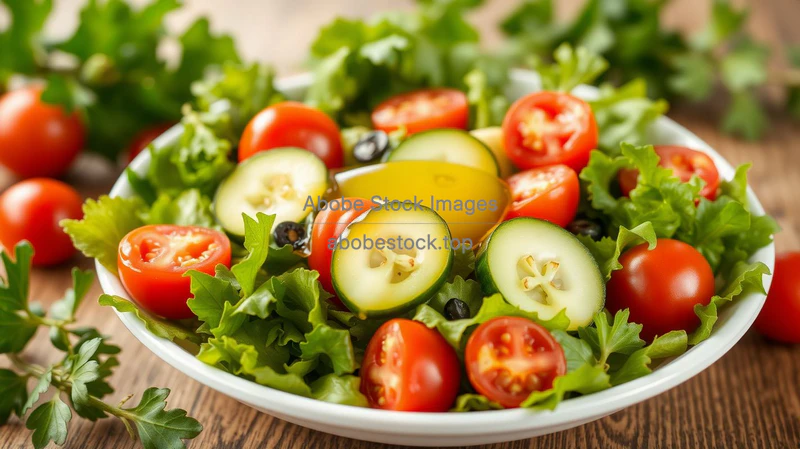 Fresh salad with leafy greens cherry tomatoes cucumber and olive oil dressing