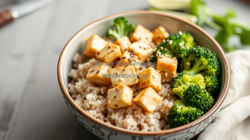 Healthy brown rice bowl with tofu broccoli and sesame seeds