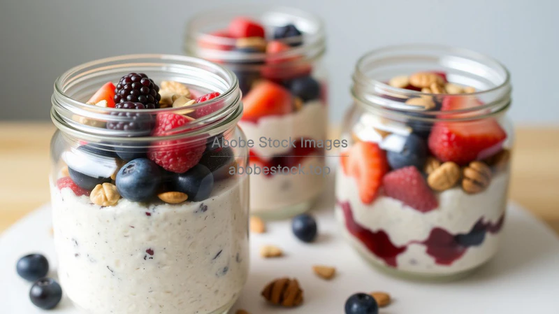 Healthy overnight oats in glass jars with fruit and nuts on top