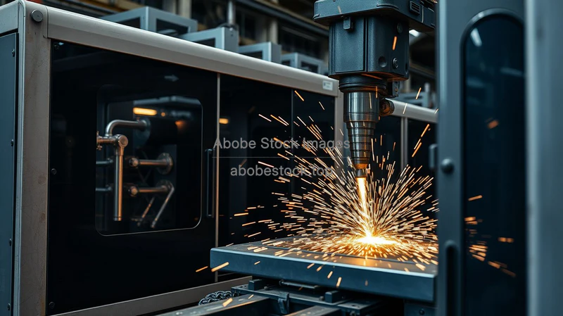 Heavy machinery factory with huge CNC machines cutting metal sparks and metal shavings flying macro shot