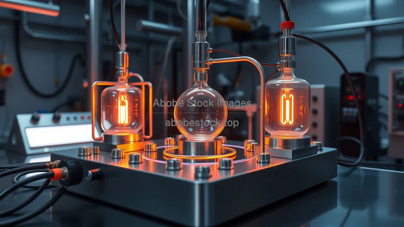 Helium cooled quantum experiment setup with cables sensors metallic surfaces realistic lab lighting