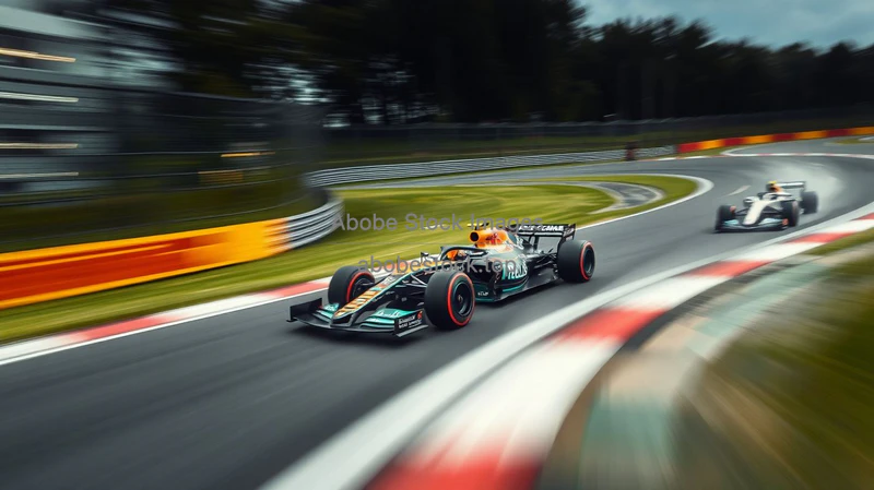 High speed Formula 1 car on a racetrack corner motion blur dramatic perspective