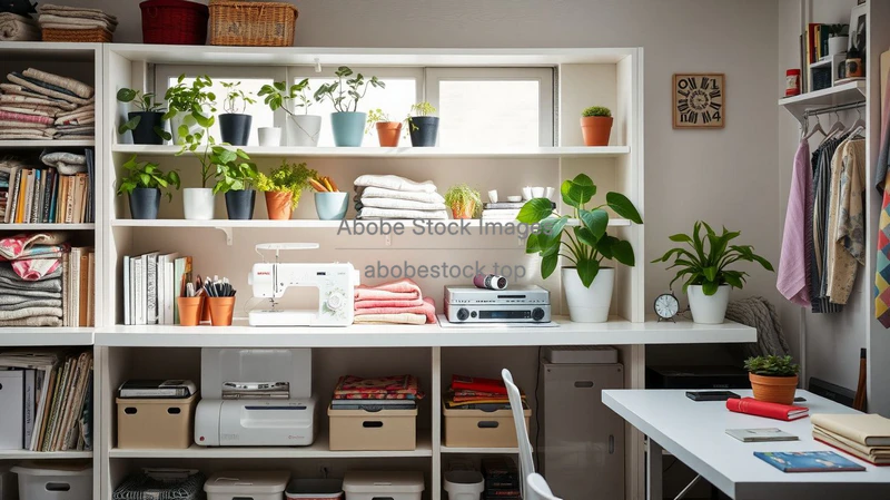 Home studio with sewing machine, fabric, and plants on shelves, well lit creative space