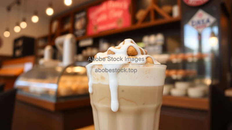 Iced cinnamon roll latte with icing drizzle, pastry shop interior, warm cozy vibe