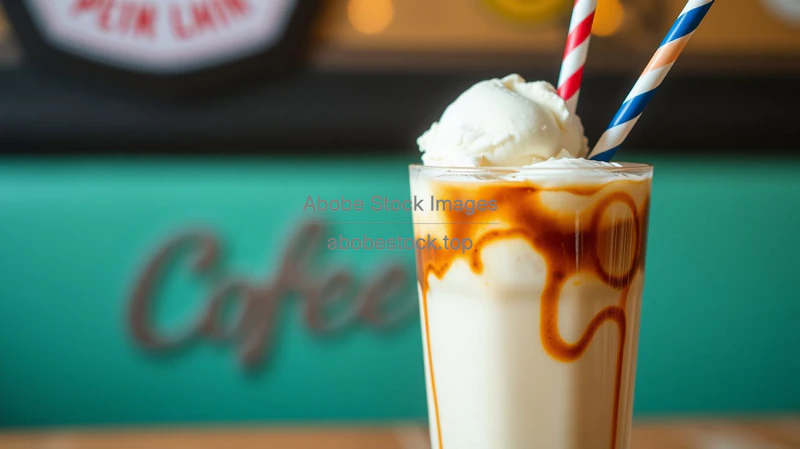Iced coffee float with vanilla ice cream scoop, striped straw, retro vibe, bright colors