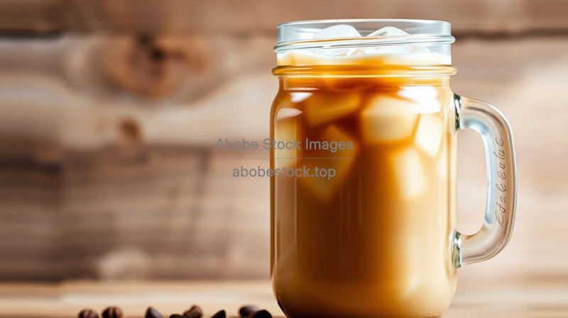 Iced hazelnut coffee in mason jar, rustic wooden background, natural daylight