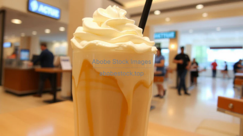 Iced white mocha with whipped cream and white chocolate drizzle, mall cafe background