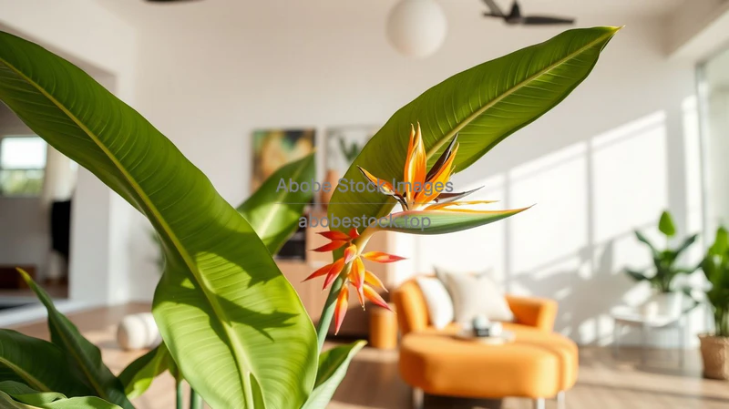 Indoor bird of paradise plant with large leaves, modern furniture, soft daylight
